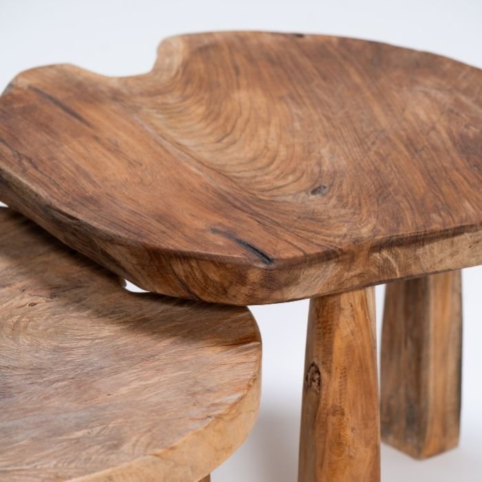 סט שולחנות עץ טיק טבעי בגימור גס ופראי, שולחנות שיוסיפו לכם סטייל בניחוח טבע אמיתי.