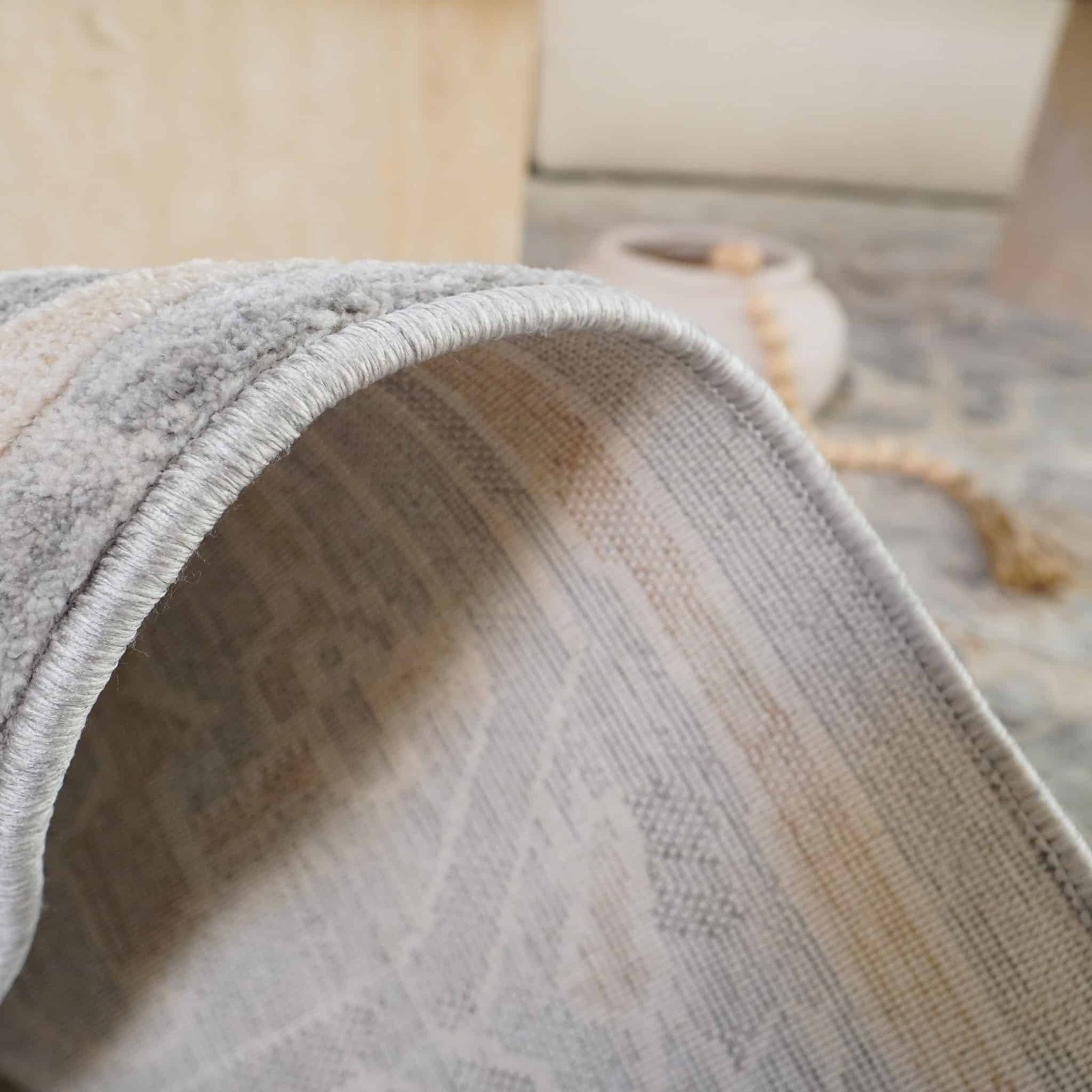 שטיח ריצפה מלבני, ארוג דוגמאת קוו מפותל, בגובה סיב משתנה.