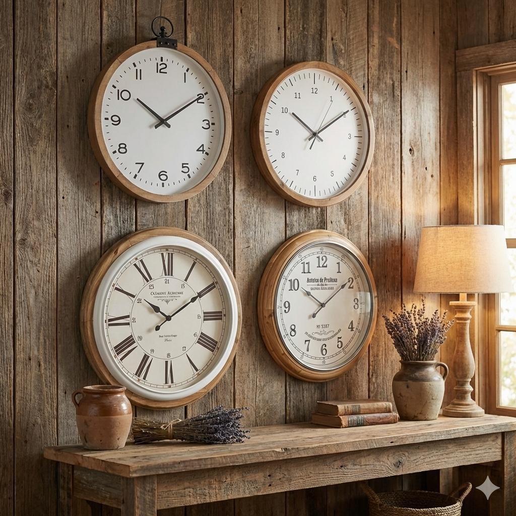שעון עץ מעוצב בסגנון רטרו, דופן מתכת שחורה ורקע עץ וינטאג' מהמם.