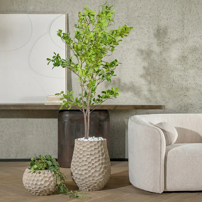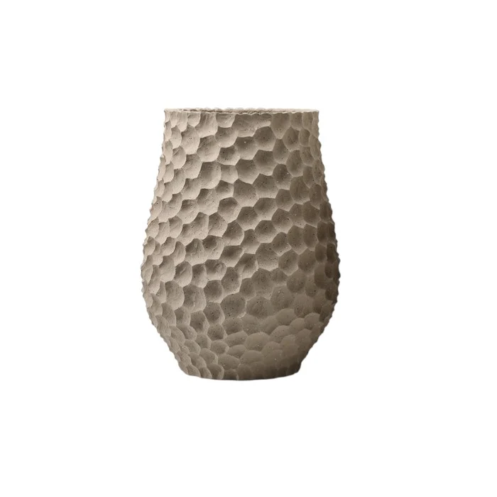 בית עציץ מרשים בגוון אדמתי ובטקסטורת שברי חול קשיחים.