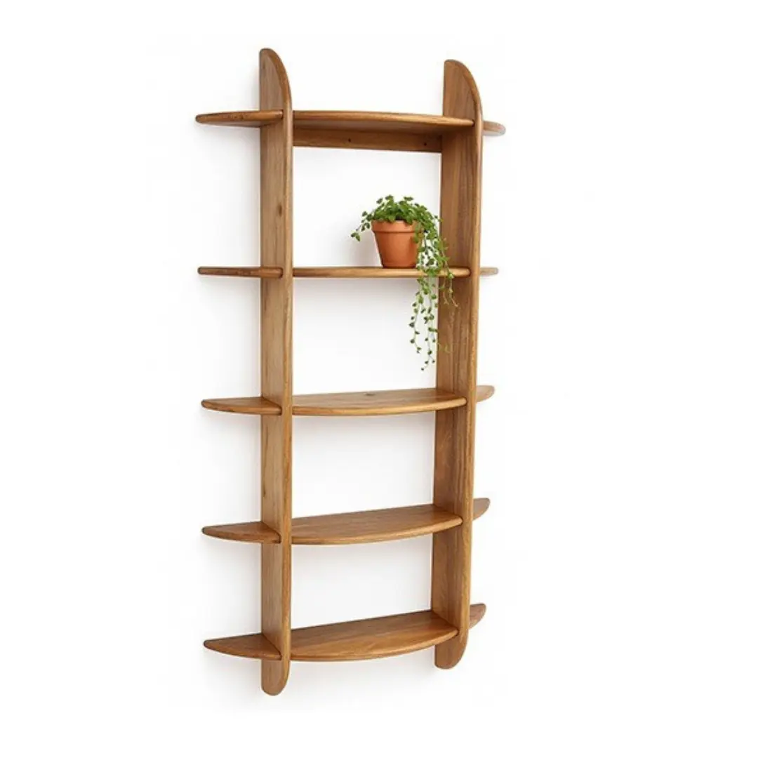 מדף תלייה דקורטיבי עשוי עץ מנגו טבעי, עיצוב נקי ומדפי עץ בפינות מעוגלות.