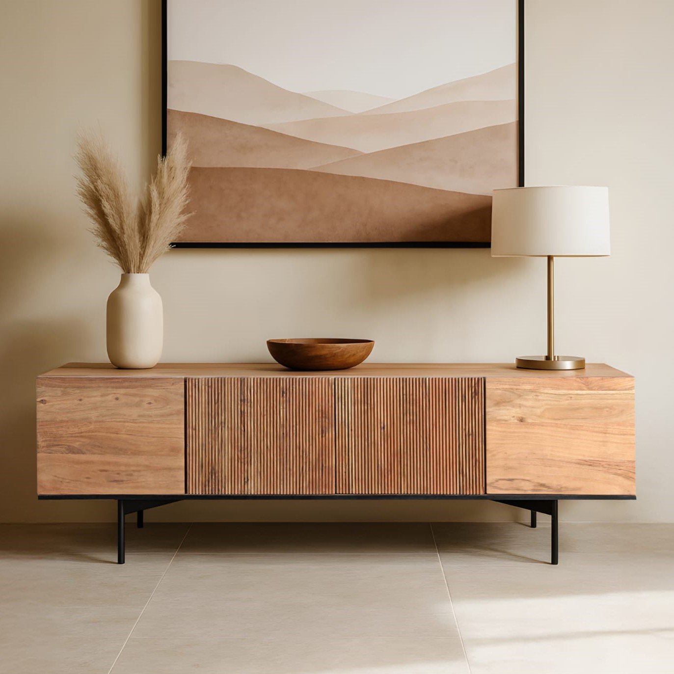 מזנון מהמם בסטייל מודרני, דלתות אחסון עשוי עץ השיטה טבעי בשילוב מתכת בצבע שחור!