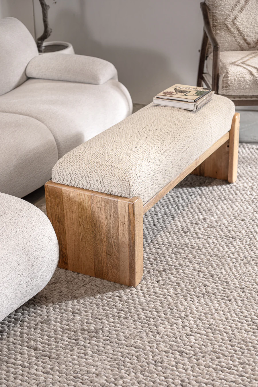 ספסל אירוח אלגנטי בעיצוב כפרי נקי, כרית מושב בגוון אבן בהיר מעצימה את התחושה הטבעית ברהיט.