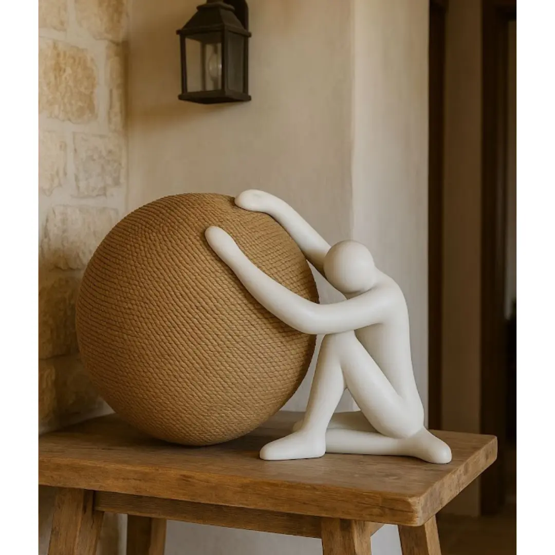 פסל דקורטיבי של אדם מחזיק כדור קש ענק בעיצוב פשוט מדהים, עשוי אבן וולקנית בעבודת יד ייחודית ושילוב חומרים טבעיים.