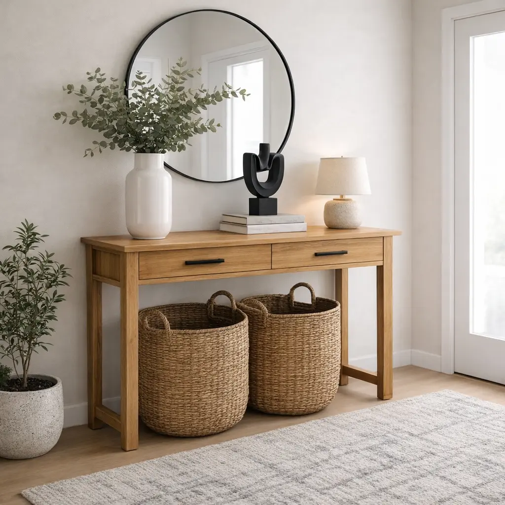 קונסולה מדהימה לכניסה או חדר השינה בעלת 2 מגירות אחסון, עשויה עץ טבעי ממוחזר.
