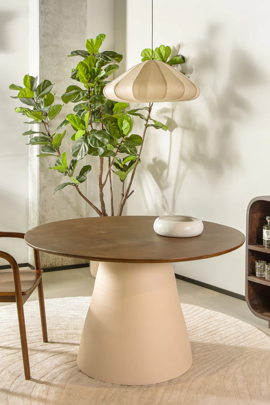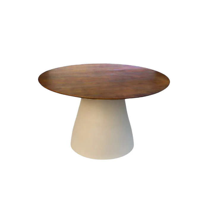 פלטת עץ טבעי בגימור חלקלק ניצבת על רגל קונוס ברזל רחבה בשילוב מושלם, שולחן מרשים בסטייל מרענן!