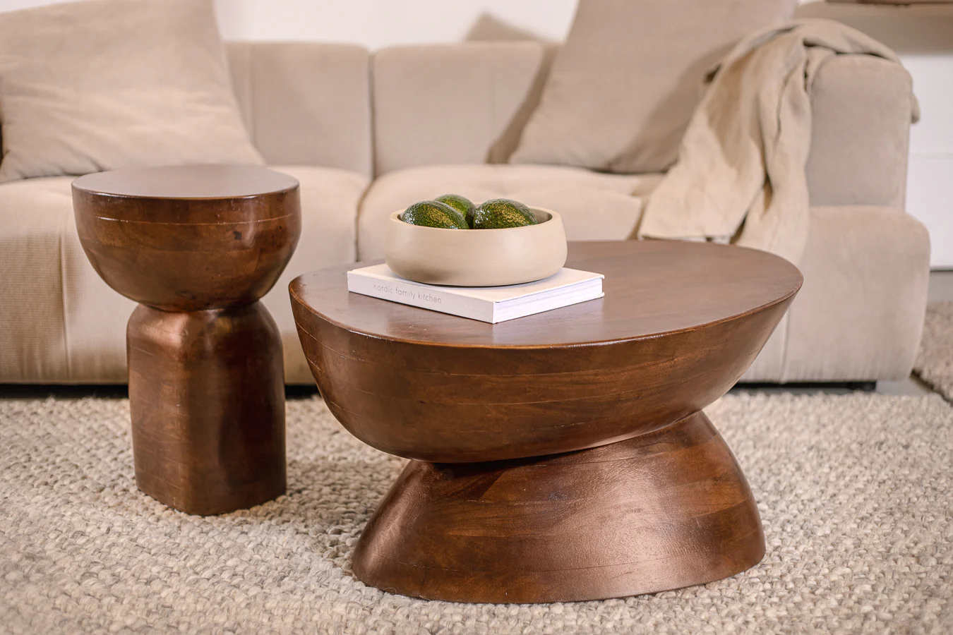 עשוי עץ מנגו גושני המעוצב מקשה אחת בגימור אמורפי חלק.