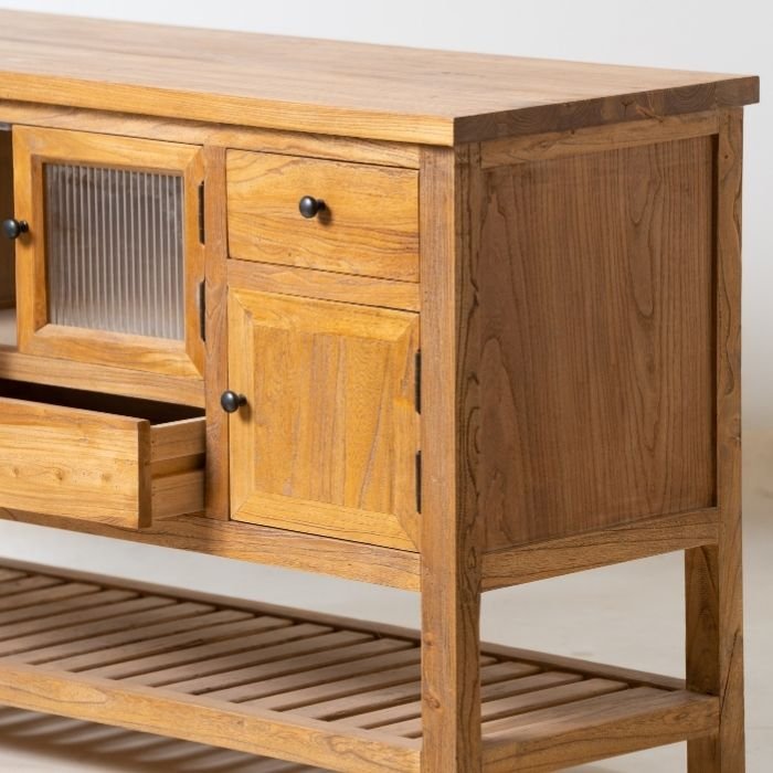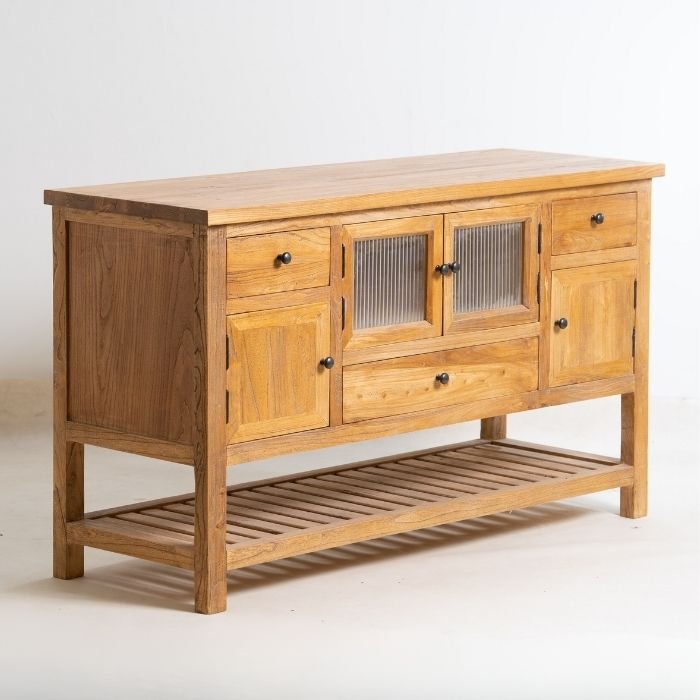 שידה עץ טבעי מדהימה בעיצוב כפרי חמים וקלאסי, מגירות ודלתות לאחסון רב ושימוש נוח!