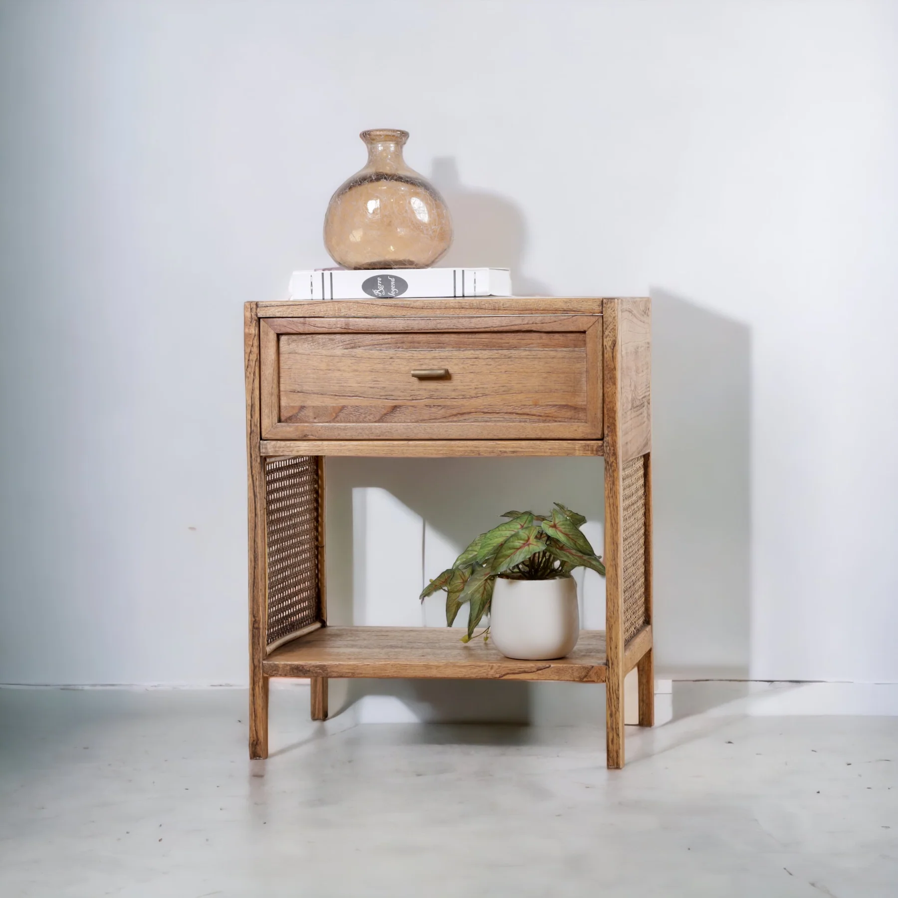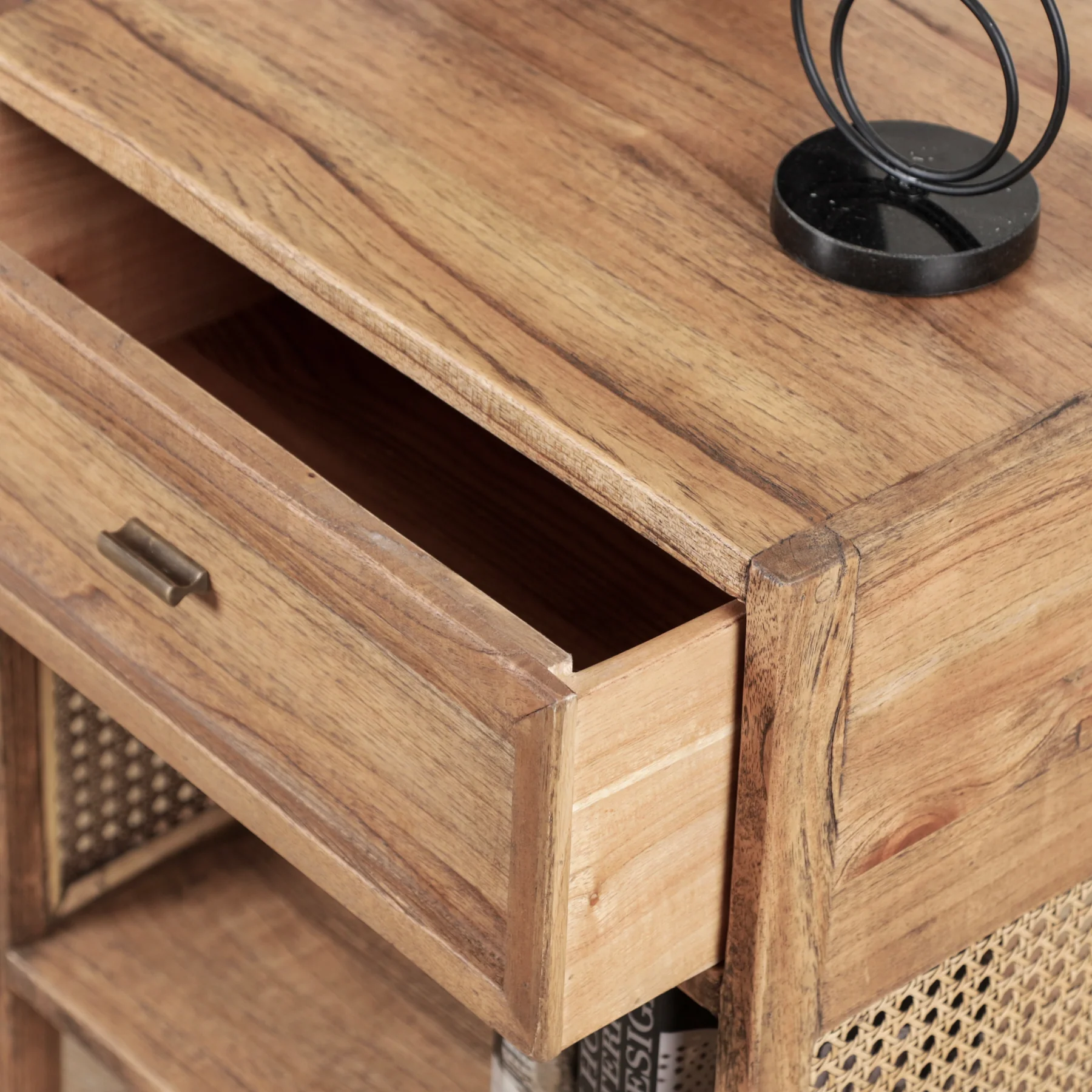 שידת צד מהממת עשויה עץ אינדונזי כהה בשילוב ראטן וניצאני טבעי, מגירה ומדף תחתון לנוחות מקסימלית