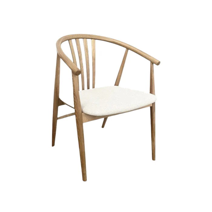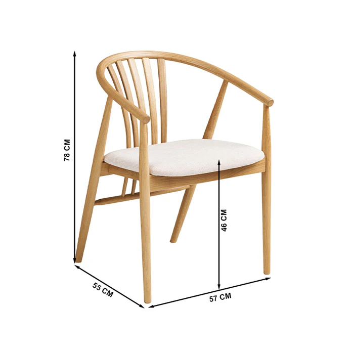 המושב מרופד בבד אריג בגוון בז’ רך, המעניק נוחות גבוהה ומשתלב בהרמוניה מושלמת עם גוון העץ.